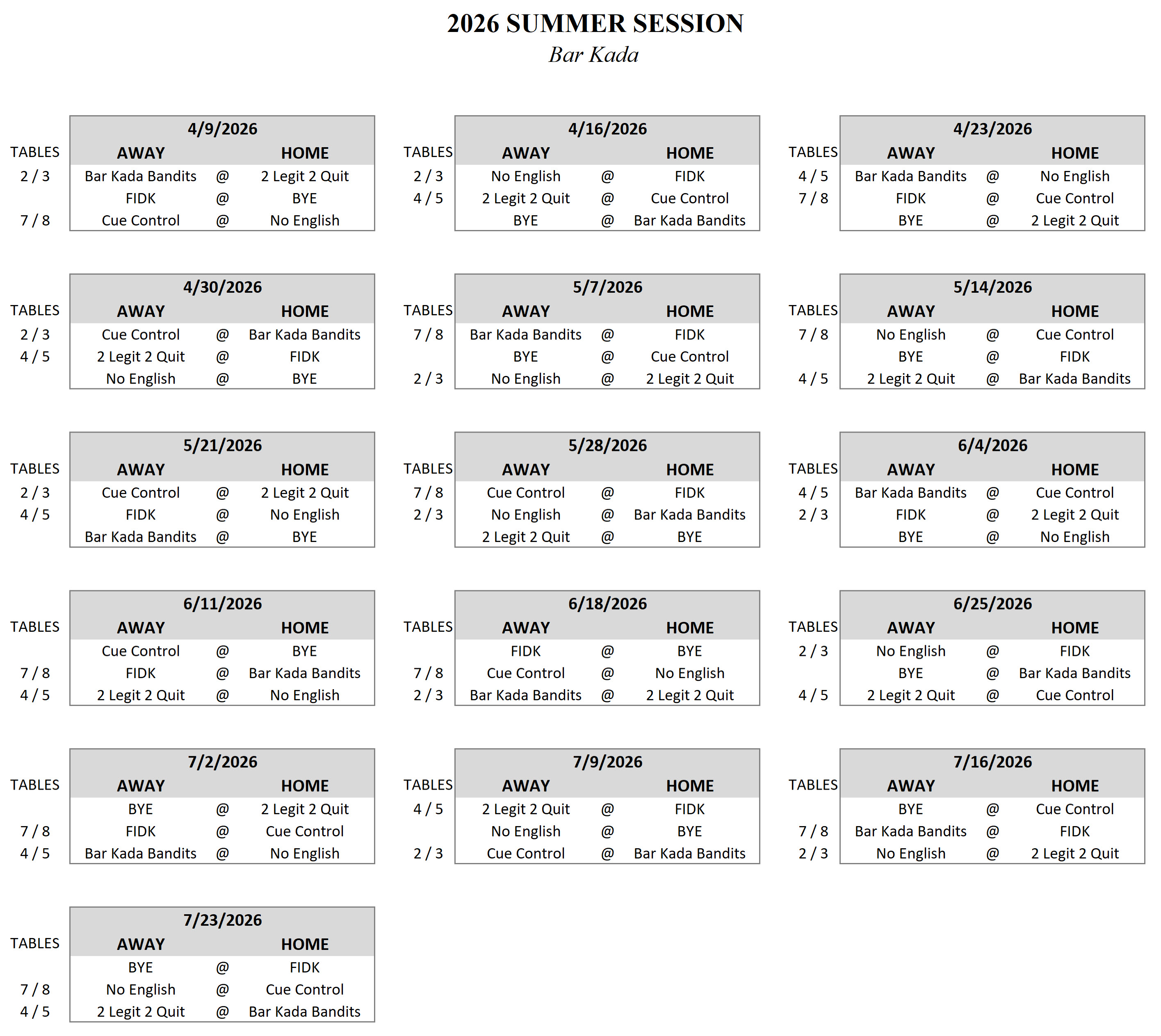 Calendar   |   Standings   |   Table Assignments   |   Updates