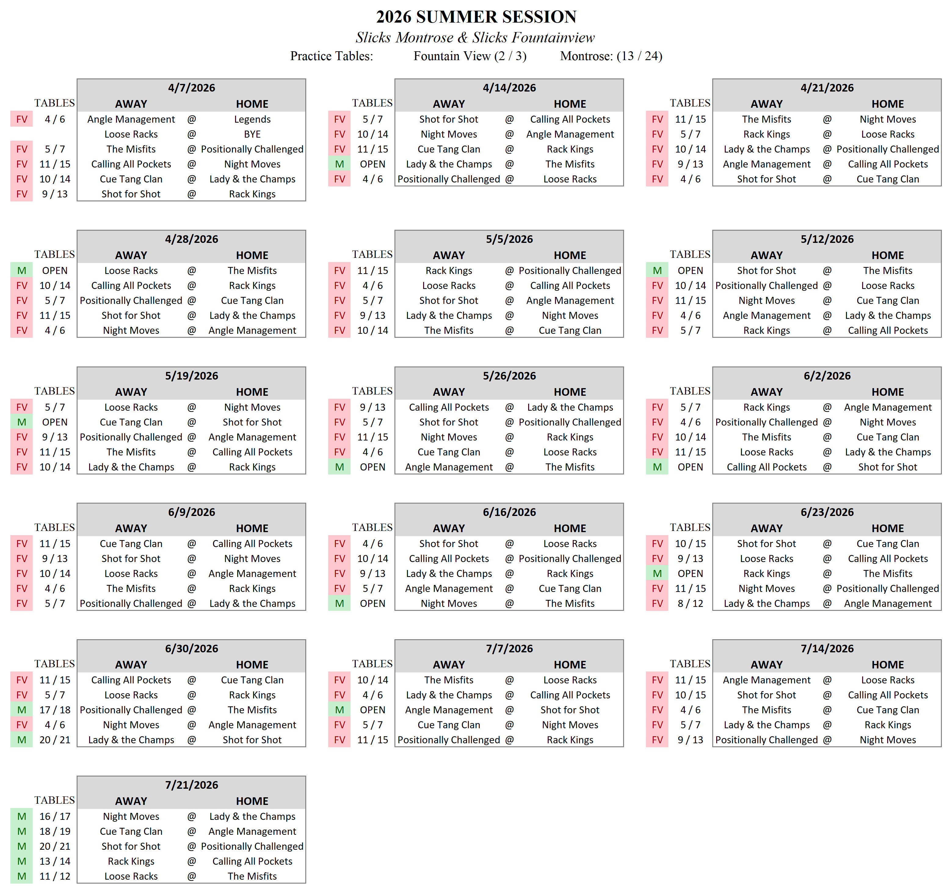 • Slicks Montrose/FV Tuesday