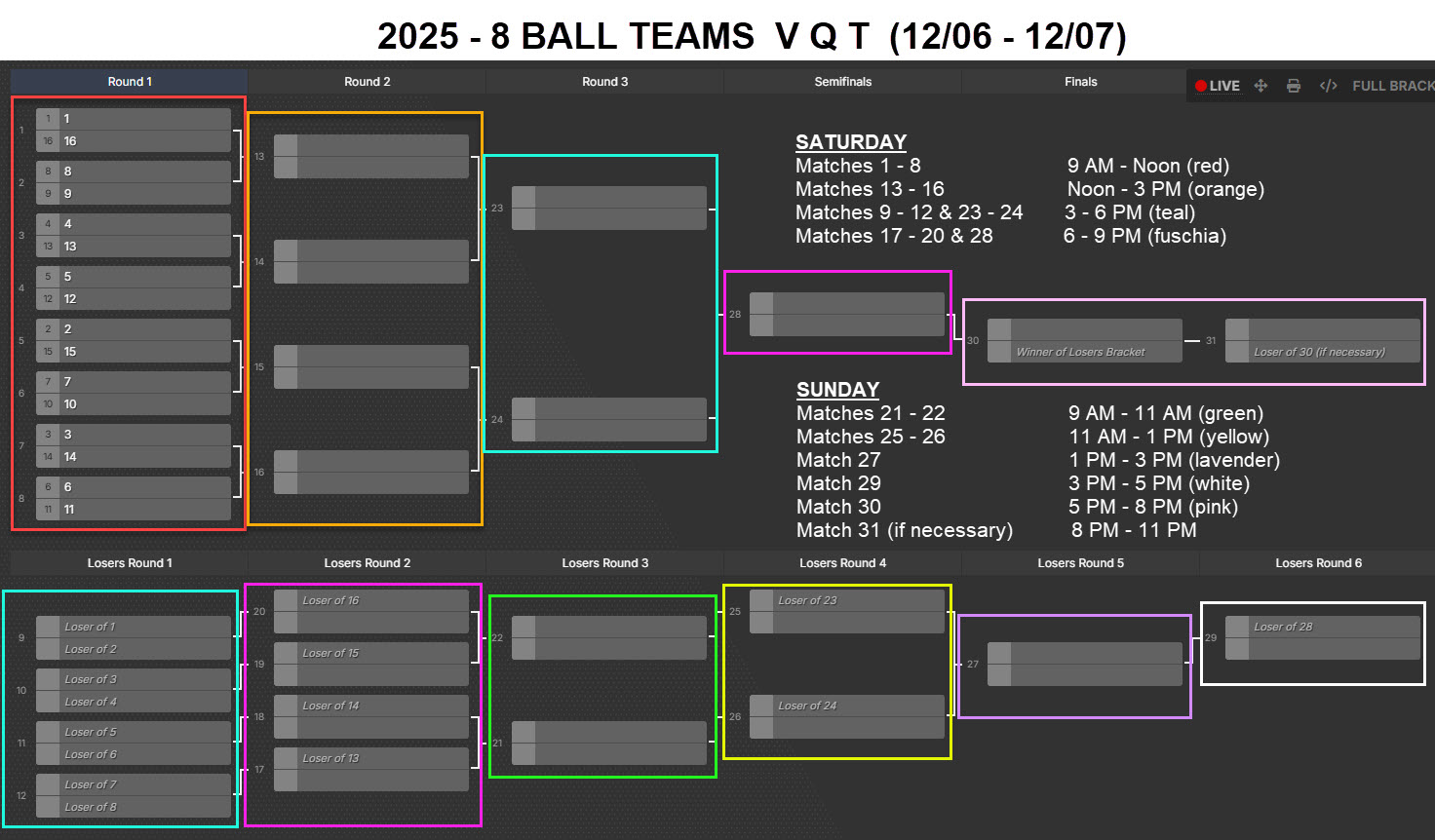 All qualified teams as well as the 8 Ball Wild Card spreadsheets have been updated. You can view this on the website by going to DIVISIONS -> VQT.