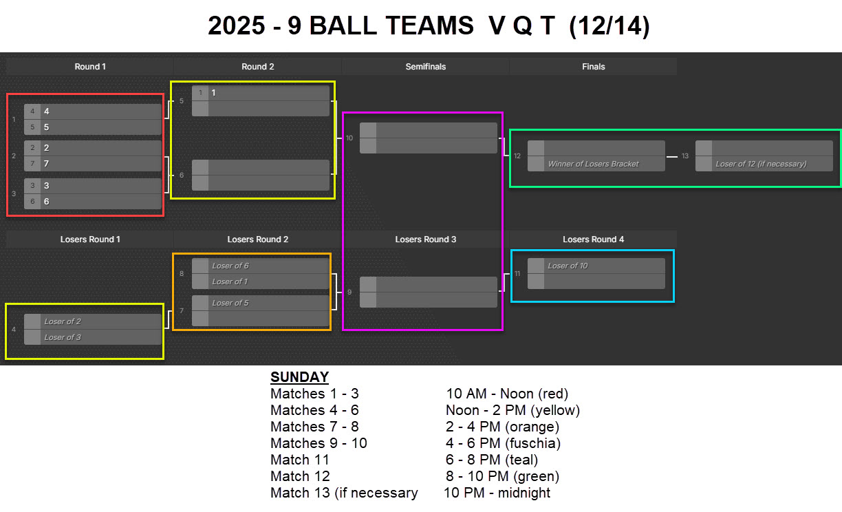 – 9 Ball 1st: Rack Kings (VQT auto qualified)