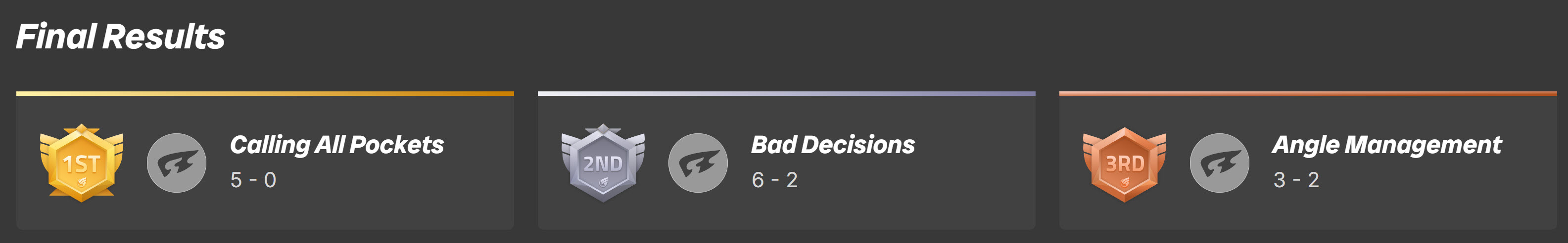 – 8 Ball 2nd: Cue Tang Clan (VQT auto qualified)