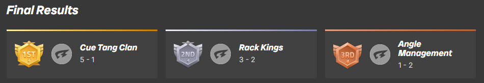– 9 Ball 2nd: Cue Tang Clan (VQT auto qualified)