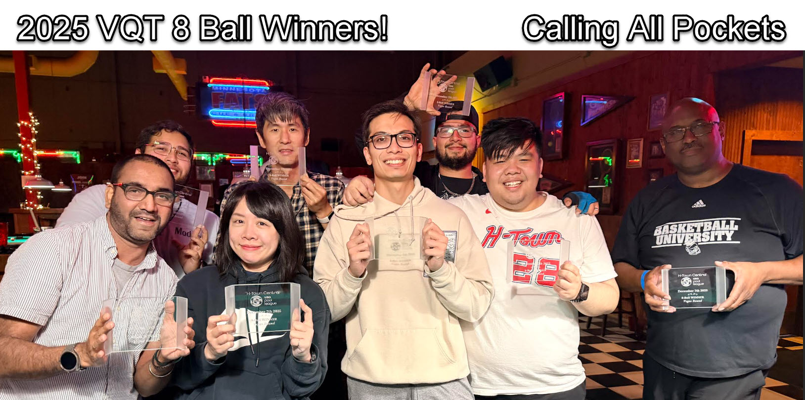 This past weekend was the Vegas Qualifying Tournament (VQT) aka finals for 8 ball teams. It was a long and grueling event and every team shot their hearts out. In the end, there can only be one winner. Please congratulate CALLING ALL POCKETS for going through the bracket UNDEFEATED! We are excited to have them represent H-Town Central in Las Vegas in February.